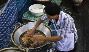 Thai cook fries chicken burning-hot oil with his completely bare hands.