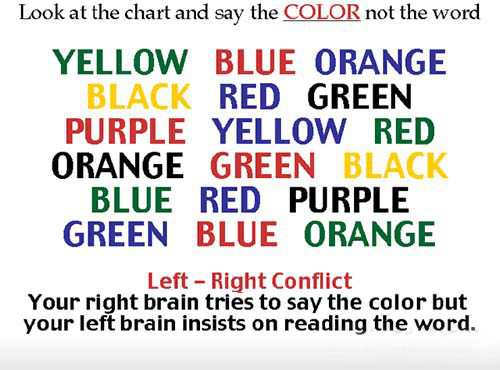 your right brain tries to say the color and your left brain insist to say the word, thus, causes you to slow down the process.