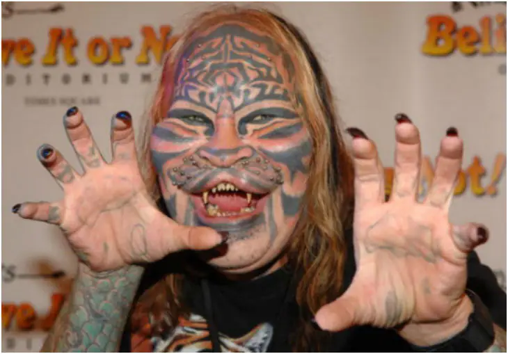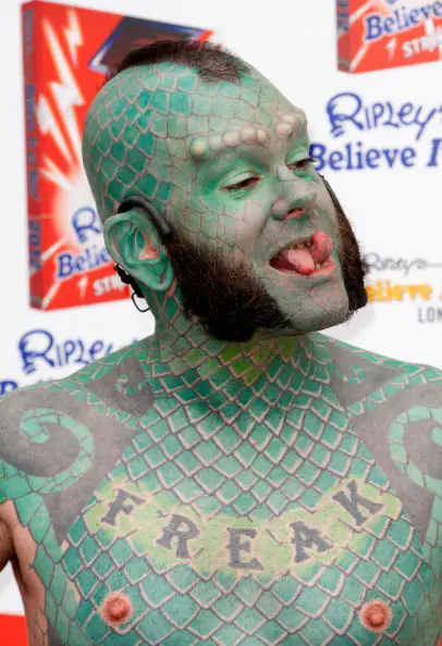 Eric Sprague, famously known as The Lizard Man, is a standup comedian and sideshow actor. He tattooed his body green and got a split tongue. He then made his look a career. Smart guy but if you need to look like him, tattooing the word “FREAK” on your chest may be unnecessary!
