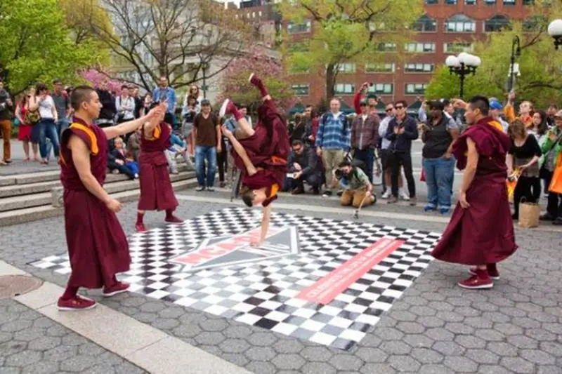 He had been practicing Buddhism since 1994 and hosted many Tibetan Freedom concerts in support of Tibetan Independence and to help spread messages of nonviolence. When asked why he was drawn to Buddhism, Yauch explained in an interview with Tricycle Magazine in 1994:[quote_box_center]”The feeling I get from the rinpoches and His Holiness [the Dalai Lama] and Tibetan people in general. The people that I’ve met are really centered in the heart; they’re coming from a real clear, compassionate place. And most of the teachings that I’ve read about almost seem set up to distract the other side of your brain in order to give your heart center a chance to open up. In terms of what I understand, Buddhism is like a manual to achieve enlightenment.”[/quote_box_center]At the Littlefield Performance and Art Space, Brooklyn, a group of ‘monks’ amazed onlookers with an incredible break dance. They awed everyone in attendance as they jigged to ‘Ch-Check it out’ by Beastie Boys.