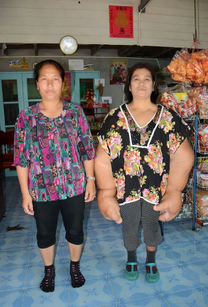 Doctors believe that this woman has the “World’s biggest hands” since each of her arms weighs one and a half stone. Duangjay Samaksamam is a shop owner from Surin province in Thailand.  For over 50 years, she has suffered from a very painful and rare condition  that has her limbs permanently swollen.