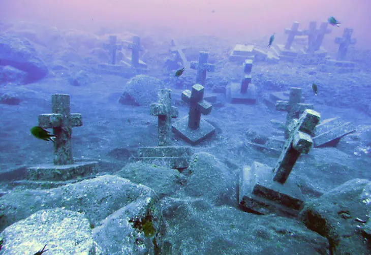 While this may look like a grave site that is flooded, it is in fact an underwater memorial to a group of Jesuit missionaries who were travelling from Portugal to Brazil in 1570. A French pirate named Jacques Sourie boarded their ship and then he and his men killed all the priests; some of the priests even had their limbs cut off and then were thrown overboard. Only the cook on the ship survived the massacre.