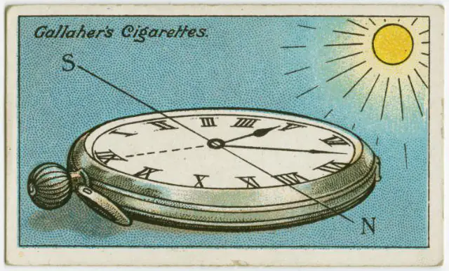 Point the hour hand at the sun. Lay a blade of grass or wire crosswise between the hour hand and the figure twelve. The end of the wire between twelve and the hour hand points south.