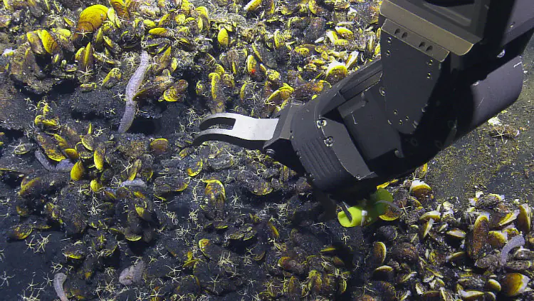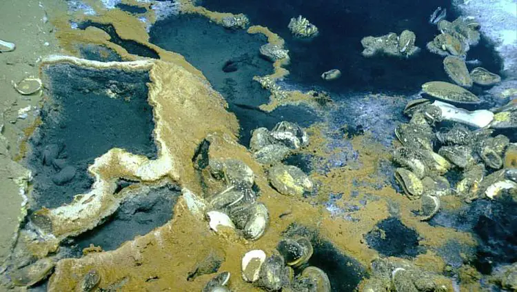 Despite the inevitable death trap that is the lake, life thrives at its borders. In a symbiotic chemosynthesis, the bacteria that live on the shells of these mussels convert the methane and hydrogen sulfide at the borders to feed the mussels. Image Source: strangesounds