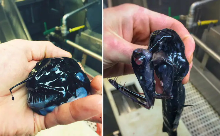 These two dark deep sea creatures might look as if they’ve been slathered in tar. But, their pitch black color could be to avoid being sighted by their prey.