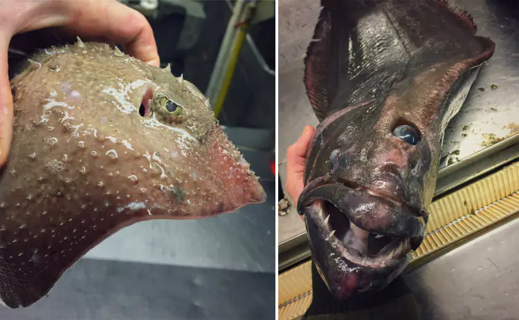 Image Source: rfedortsov Two strange fishes caught in the trawl. The one on the right with only one eye on the top of its head is actually a halibut.