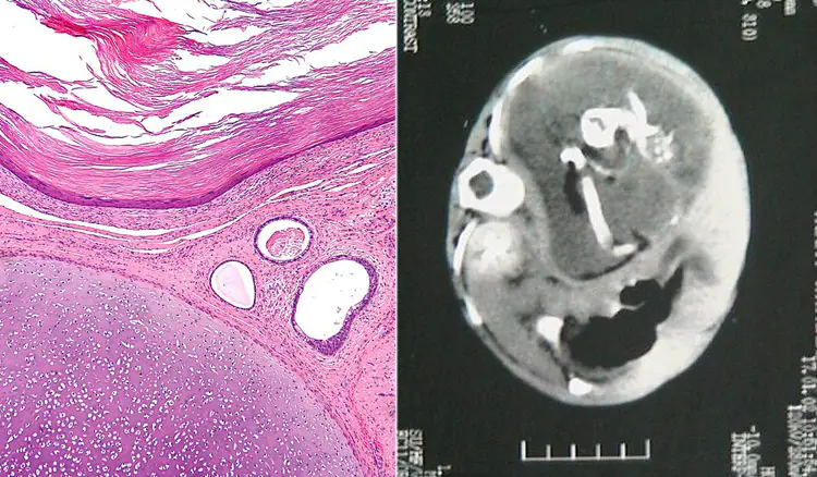 2 Tumors can have hair, teeth, bone, and even complex organs such as eyes and brain matter. In rare cases, they can also contain structures resembling a fetus. Image Source: wikipedia, Nisreen M Khalifa et al