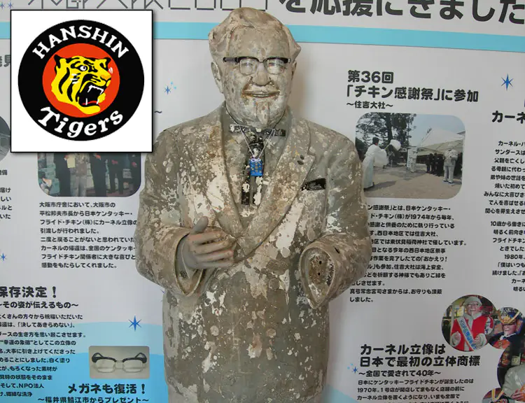 2 In Japan, fans of the baseball team Hanshin Tigers believe that the ghost of KFC’s Colonel Sanders cursed the team preventing subsequent wins after they threw his statue in a river while celebrating victory in 1985. Image Source: wikipedia, Hanshin Tigers