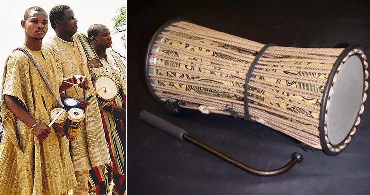 An hourglass-shaped drum is one of the oldest instruments used in West African tribes. The “talking drum” is also used as a mode of communication where a skilled player can play whole phrases. They sound like humans humming. The pitch of the drum is regulated to mimic the tone and sound of human speech, but it lacks the qualities of vowels or consonants.