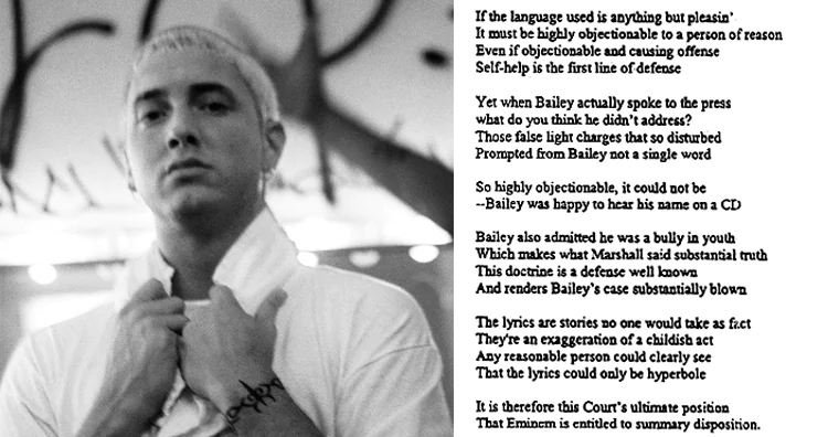 1 In 2003, when Eminem was sued for slander, the judge threw out the case and gave a 14-page ruling by rapping it.