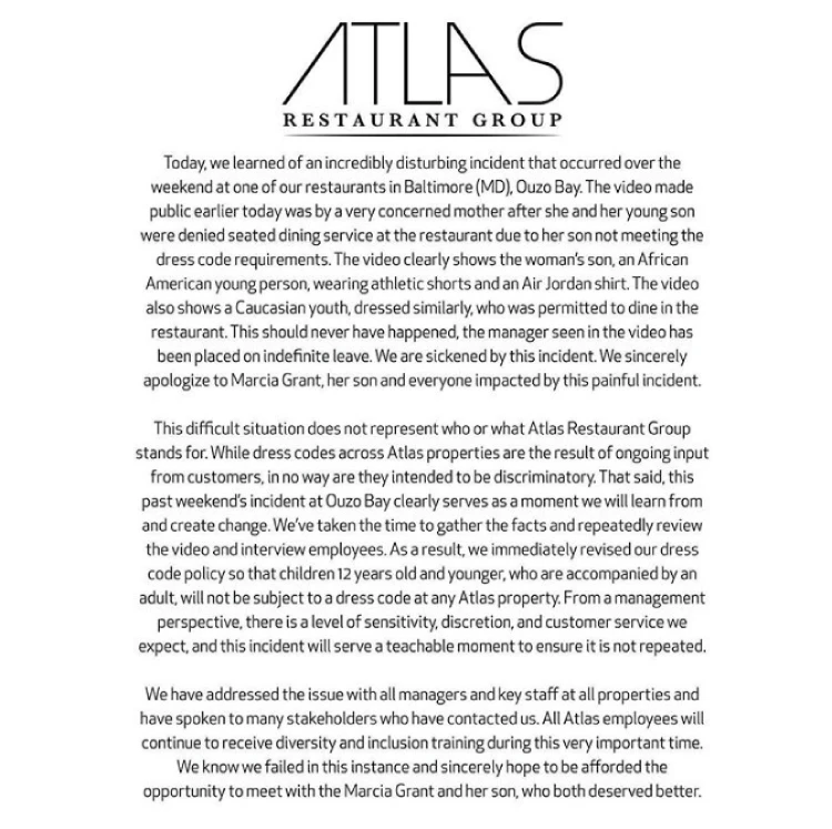 Atlas Restaurant Group responded to the situation, calling it “disturbing.” The restaurant group placed the manager involved on indefinite leave and issued a public apology.