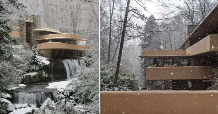 1 Falling Water â Designed by Frank Lloyd Wright, this house is built over a waterfall in Pennsylvania.