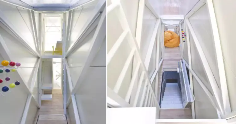The foldable stairs in the house create more space in the house. Also, the entire interior is painted white to make it look spacious. Due to the limited size, the building’s electricity is obtained from a neighboring building.