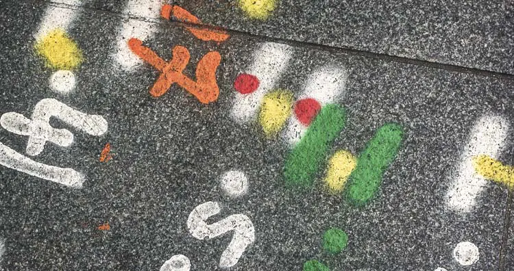 5 Spray paint designs on sidewalks and roads are called âutility graffitiâ and use a specific set of colors and symbols. These are actually used to mark any underground pipes and wires for various purposes. Such markings became standard after 1976 when a dig in California punctured a petroleum line and created a fatal explosion. Utility graffiti