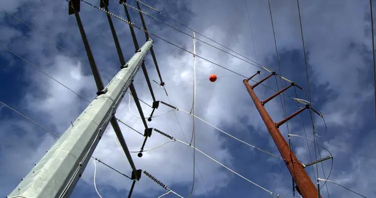 The Federal Aviation Administration (FAA) specifies the use of such “aviation orange, white, or yellow balls” on power lines, preferably with an alternating color scheme. The FAA also states the required spacing between the balls so that there are enough of them to catch the attention of pilots.