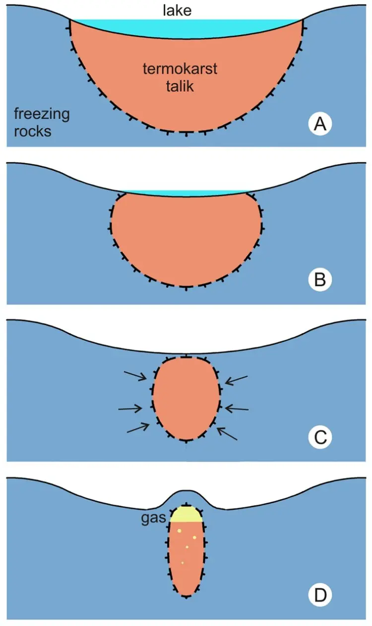 Scientists think that the exploding craters occur from the build-up of methane gas in pockets of thawing permafrost. The gas is released alongside carbon dioxide when microbes feast on organic matter in the talik. One idea is that methane finds its way up to the talik.