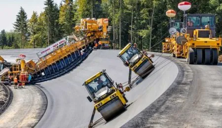 A special kind of bridge pavers from SMB Construction International GmbH (SMB) are used for the construction of parabolic-shaped, banked curves. These pavers equipped with precisely controlled rollers help carry out accurate compaction of inclined and parabolic road surfaces.