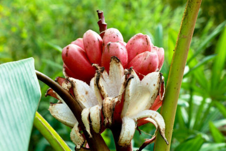 There is a species of wild banana that is pink in color and fuzzy in texture. When ripe, the pink bananas peel back on their own. Although they are mostly grown for ornamental purposes, the soft and sweet fruit can be eaten. The seeds are quite hard and can even damage your teeth.