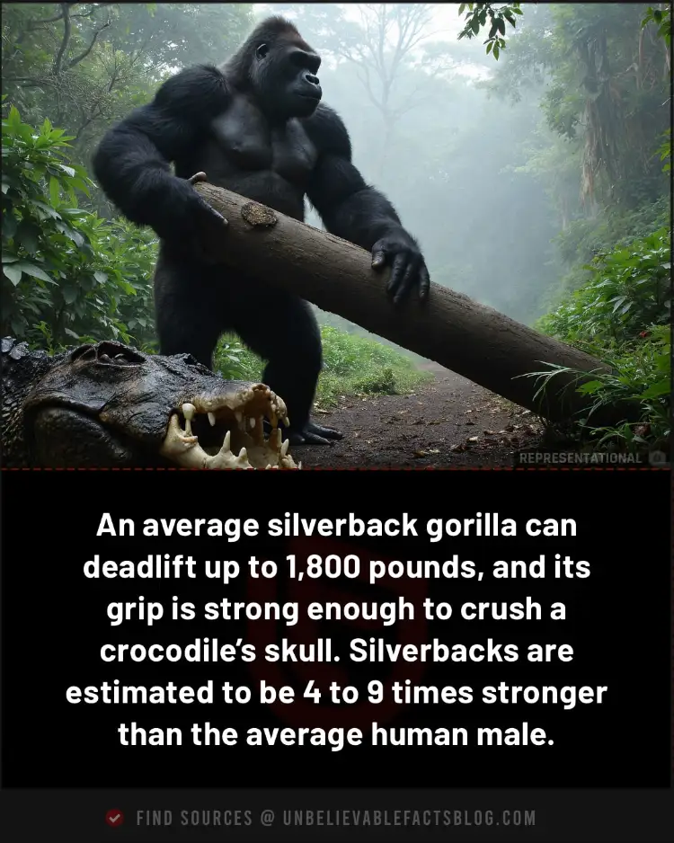 Silverbacks deadlift 1,800 lbs, 4–9 times stronger than humans.