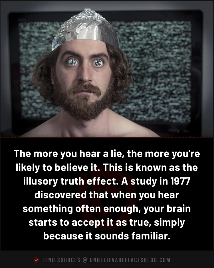 The more you hear a lie, the more likely you are to believe it. This is known as the illusory truth effect. A study from 1977 revealed that when you hear something often enough, your brain starts to accept it as true just because it sounds familiar.