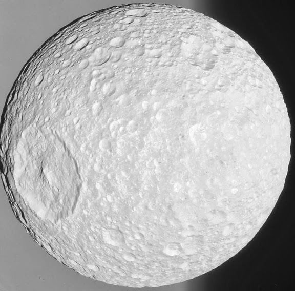 Mimas – NASA-ESA-ASI, Cassini-Huygens (February 13, 2010)Â Mimas as viewed from Cassini spacecraft. Image courtesy: NASA, ESA, ASI