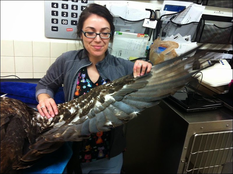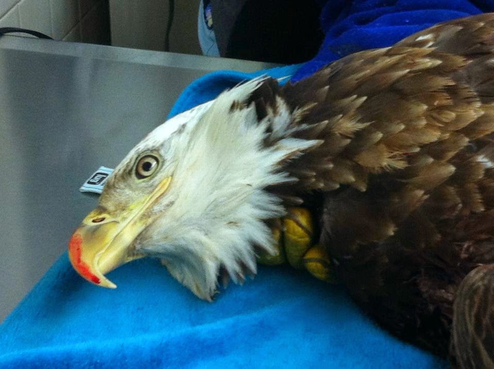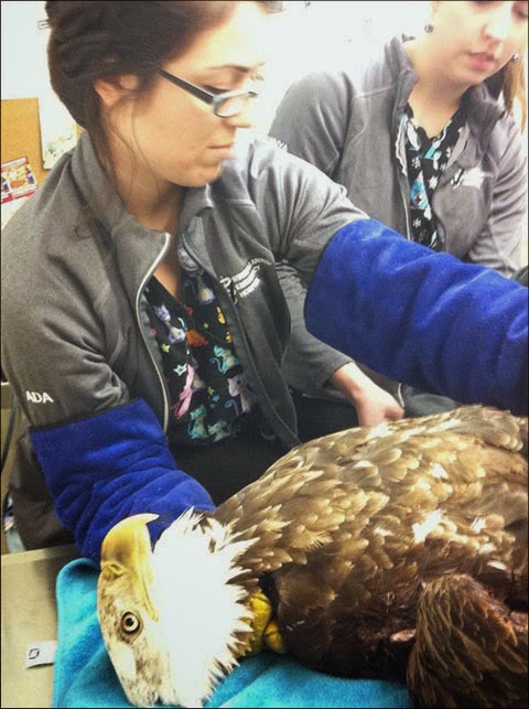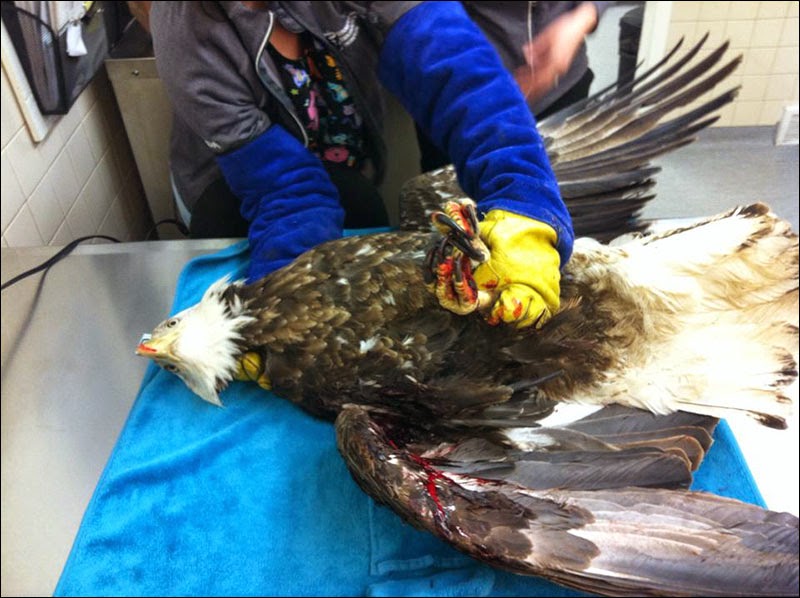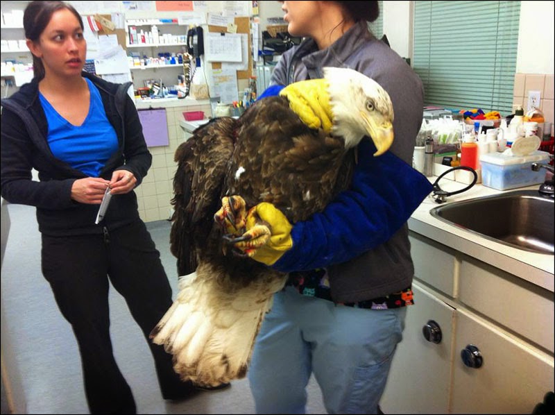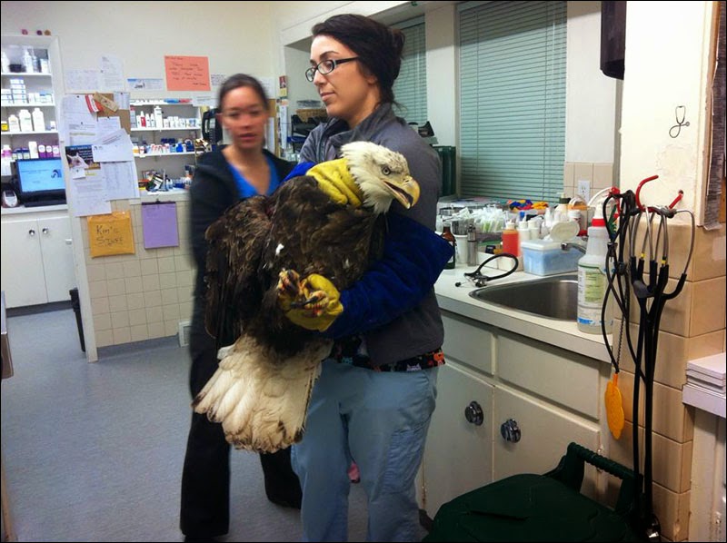 Lots of animals go looking for medical services at a 24 hour animal hospital. Dogs, Cats, Sheep and the like, all need a vet at some time in their life. Sometimes people are kind enough to take injured wildlife to the vets too. This happened at a 24 hours emergency hospital, when an injured bald eagle was brought in. The eagle had broken its wing- an open fracture where the skin had been punctured by a bone. He surprised them with his weight and size. He was large and surprisingly heavy. They named him Freedom which was quite appropriate.