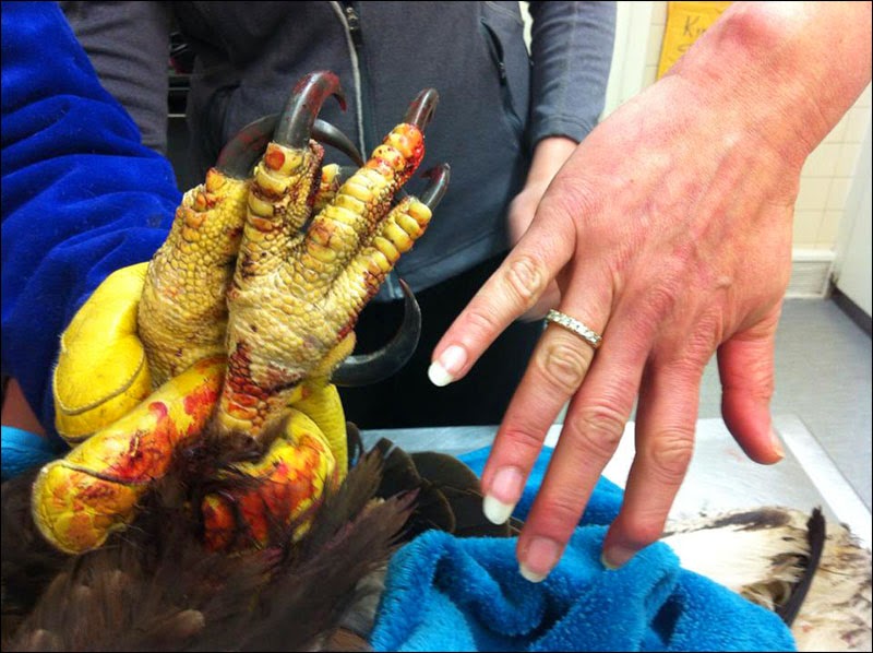 They suspected his broken wing was as a result of a car hit. They were however able and happy to help the eagle out. Compared to the hand of a vet, his talons were big but Freedom remained calm throughout the whole procedure. They patched him up pretty good and sent him on his way. One of those who helped out the eagle posted this update: