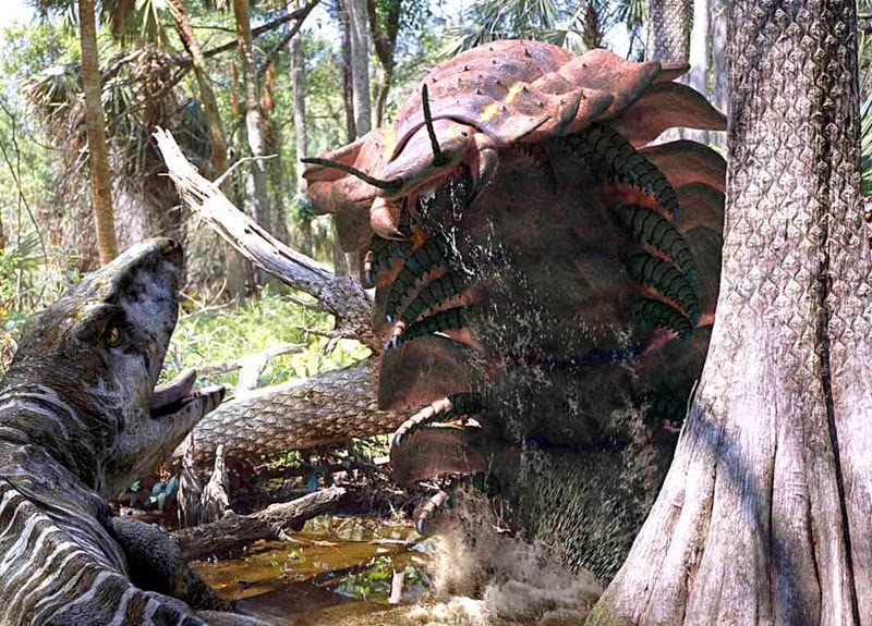 The Jaekelopterus makes the Brontoscorpio look like a small puppy. It was the size of a crocodile and with an appetite to match. The Jaekelopterus ravaged sea scorpions, ammonites, ancient fish…. Basically, anything in its wake was on the menu. It was in fact one of the largest scorpions in history.(source)