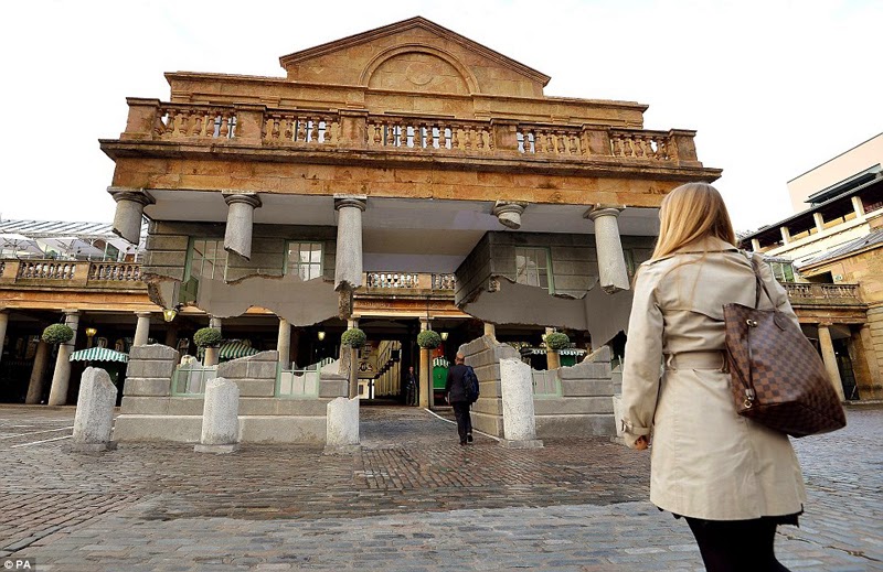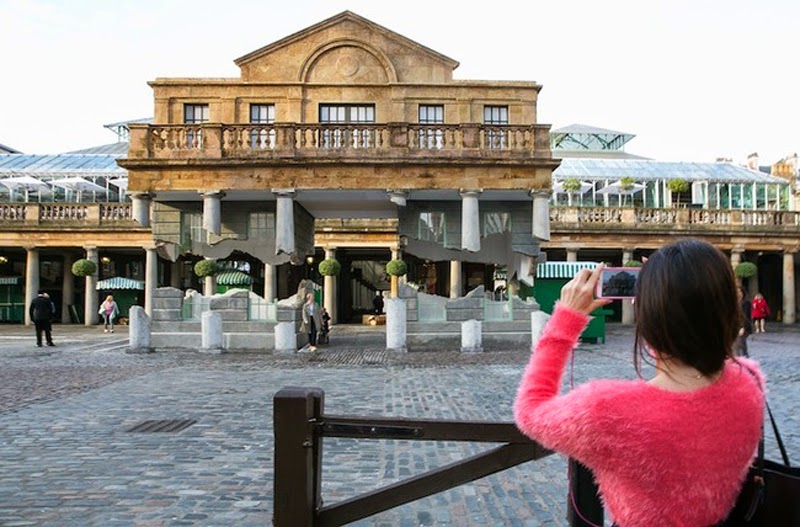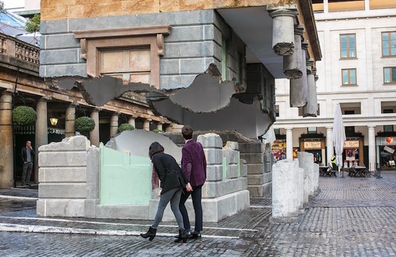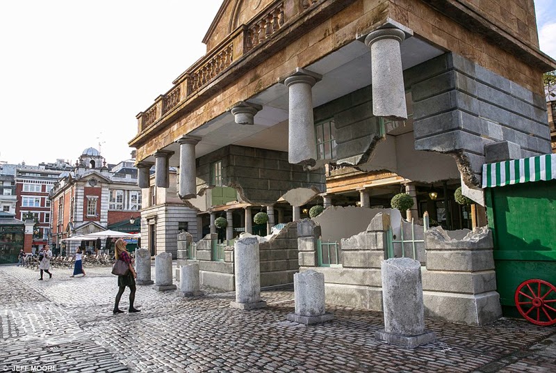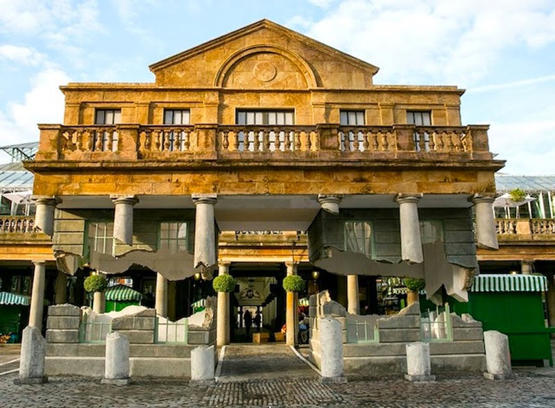 On his latest project, Alex Chinneck, a British artist, has created what looks like a floating building. The project is titled “Take My Lightning But Don’t Steal My Thunder”. Â A section of the convent Garden Market Building (which is 184 year old) looks like it’s been cut horizontally and is levitating at more than 10 feet over its detached half.