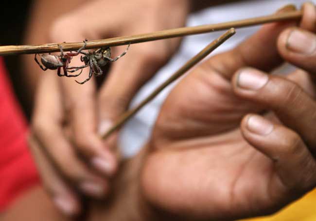 Using spiders that are native to the area, like female orb-weavers in the Philippines or male thiania bhamoensis spiders in Singapore, people will have the spiders fight for sport. The spiders are placed on either end of a stick and then prodded along until they meet and fight, sometimes to the death.