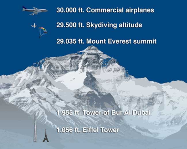 At it’s highest peak, Mount Everest is 8,848 m (29,029 ft), which may be a height that is hard to wrap your head around. The above picture should hopefully give it’s amazing height some perspective on how truly massive the mountain is. Another amazing fact about how high the summit is that water only has a boiling point of water is 71 °C (160 °F). The boiling point of water goes down when altitude goes up and pressure goes down.(source)