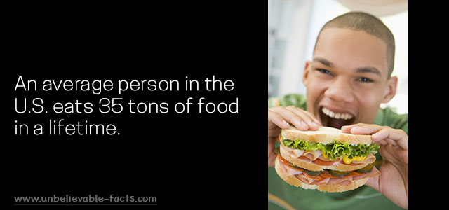 2 Big eaters! On an average, a person in the U.S. consumes about 35 tons of food in a lifetime.Image source