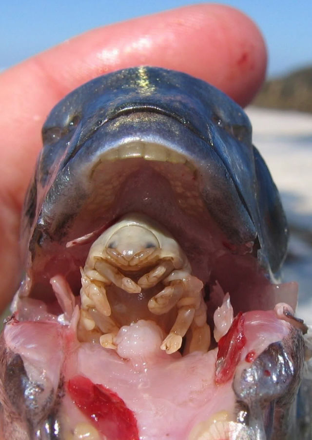 These creatures are protandrous hermaphrodites, i.e., they mature into males, then switch to become females that feed on the fish’s tongue by sucking the blood out of it, slowly but definitely causing the tongue to atrophy. However, the female plays the part of a substitute tongue only insofar as her young are born, after which it lets go of the host, and is consumed. The host, too, being without a tongue, dies.(source)
