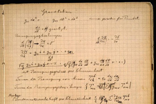 Einstein’s general theory of relativity stands above all as his greatest achievement. His search for general relativity spanned eight years. In 1955 when Einstein died, a small brown notebook “Notes for Lectures on Relativity” containing his private calculations was found among his papers. He wrote equations linking space, time, matter, and gravity every bit as beautiful as Shakespeare’s sonnets, but written in the universal language of mathematics. Every time a new test is devised Einstein’s theory wins. (source)