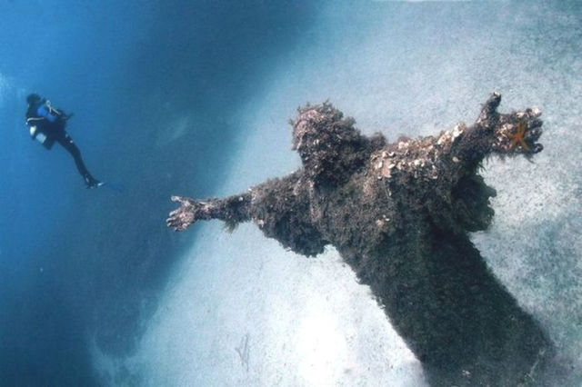 The Christ of the Abyss is a bronze statue of Christ, placed at the bottom of the bay of San Fruttuoso, Italy, in 1954. The statue, 2.5 metres in height, was the brainchild of Duilio Marcante who pushed for the installation of the statue following the death of one of the pioneers of scuba diving, Dario Gonzatti, in 1950. The statue was installed by the Italian Navy about 15 metres deep, with the help of many divers. Â The hands of Christ are outstretched, towards the surface of the water(heaven), in a sign of peace. Luckily for those who want to witness Christ of the Abyss in Italy, the dive itself is relatively simple and very rewarding.