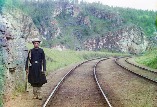 A switch operator poses on the Trans-Siberian Railroad, near the town of Ust Katav on the Yuryuzan River in 1910.