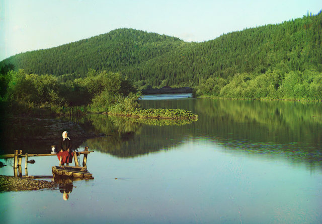 A woman is seated in a calm spot on the Sim River, part of the Volga watershed in 1910.