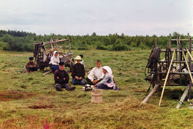 Peasants harvesting hay in 1909. From the album “Views along the Mariinskii Canal and river system, Russian Empire”.