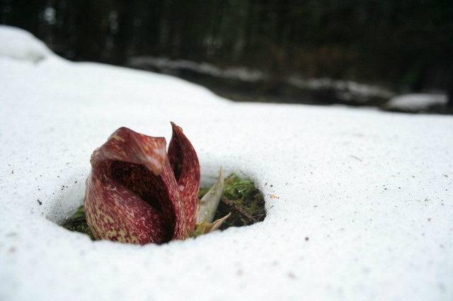 Skunk Cabbage, or Symplocarpus foetidus, which can be found in woodlands and wetlands throughout eastern Canada and the northeast United States, has the unique ability to generate heat on its own, a process which is known as “thermogenesis”. During this process, the plant uses oxygen to produce heat. The oxygen reacts with starch from the root, breaking molecular bonds apart to release energy in the form of heat.