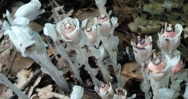 There are a whole group of vascular, flowering plants which are growing in Arkansas that do not have chlorophyll which is vital for photosynthesis. As a matter of fact, these plants, known as the “Ghost Plant”, are not green, but instead a translucent white. Their pale,shimmering color is how the plant got its common name of Ghost Pipe, Ghost Flower, and even Corpse Plant. The Ghost Plant, Monotropa uniflora, grows in the dark areas, and instead of generating energy from photosynthesis, it operates like a parasite on fungi. Ghost Pipe flowers produce pollen and seed, and usually bloom in September and October.(source)