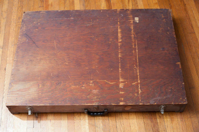 This was the oddly-shaped, wooden box recovered from the dumpster. As seen in the picture above, it looks handmade, fit with hinges, a handle and a pair of locks.
