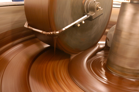 The roasted cocoa beans from Africa travel to chocolate factories where they are grinded, processed, tempered and moulded before they take the form of fancy chocolate barsGrinding cocoa beans. Image credit: Art Pollard(flickr)