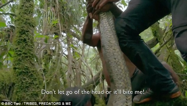 Few of the tribal members gingerly reached down to grab the snake. An army of hands knifed out to hold the gaping jaws of anaconda. It was extremely important not to agitate the calm giant. If the anaconda gets alarmed and coils around one of the members, he was assured of certain death or, at least getting few of his bones broken under its brute strength.