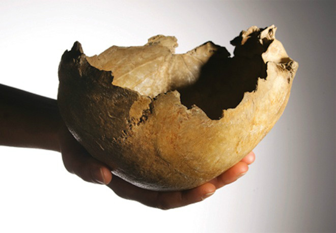 4 Skull-cups, made of human skulls, belonging to Cro-Magnon period found in Britain. Image Source: Wired