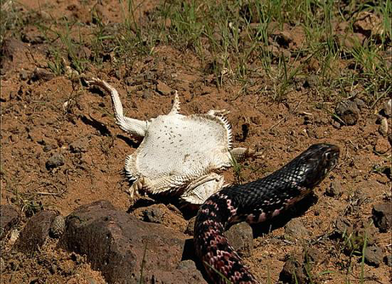 These two techniques are enough for small predators. But If a big animal attacks the lizard, it unleashes its most effective weapon. When a dog or other bigger animal approaches the lizard. The lizard takes aim and squirts a stream of blood. The taste is so terrible, the canines usually take about 15 minutes to recover from the attack.