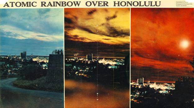 When the Starfish Prime exploded, it created “rainbow skies”. The electrons that were released entered the earth’s atmosphere and energized oxygen and nitrogen atoms, causing them to glow in different colours. The bomb was so powerful, in fact, that it artificially extended the Van Allen belts (comprising of protons and neutrons held together by magnetic fields) which could be seen from Hawaii all the way up to New Zealand.(source)