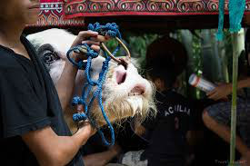 Some of the young boys catch the spurting blood in a long bamboo tube and some of the slaughtered animals are given to guests as “gifts.”