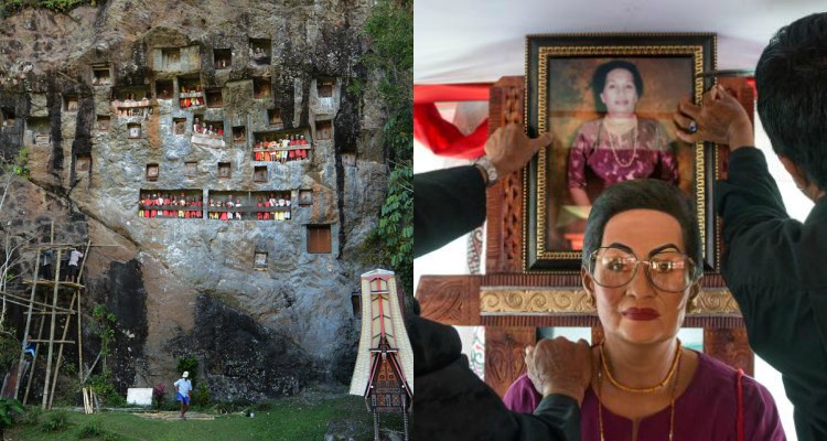 There are three methods of burial. The coffin may be laid to rest in a grave or a carved stone grave or even hung on a cliff. The stone grave is usually expensive and is used by notables or wealthy. A wood-carved effigy (tau tau) resembling the dead person is normally placed on the stone cave (grave) overlooking the land.