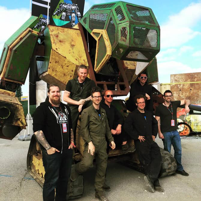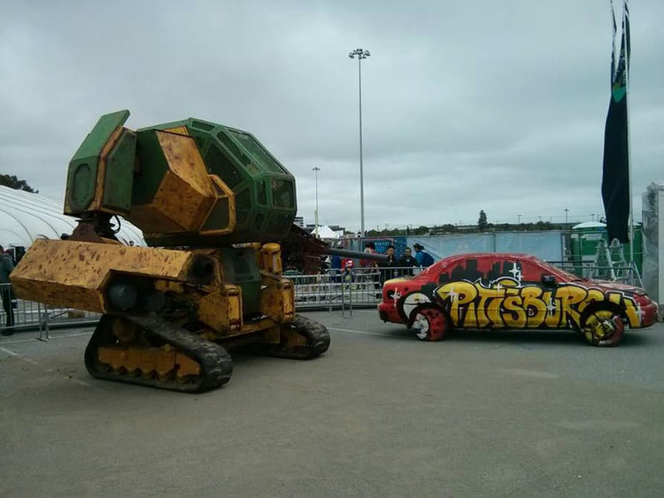 They built the Mark II in barely under a year, and it is impressive  – 15ft tall and 12,000 pounds. This steel giant moves on tank treads and has an arm cannon – yes, an arm cannon – that shoots huge paintballs at over 120 mph. Enough to dent a car. Mark II will be shuttled by two pilots, one driver and one gunner.