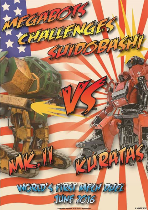 It’s MegaBots v Kuratas. Two colossal nuts-and-bolts warriors. One arena. In the most epic showdown in the history of steel and paintball, America’s giant robot Mark II will fight Japan’s equally-giant robot Kuratas. Neither will stop until there is robot carnage on the battlefield. There will be blood.Â